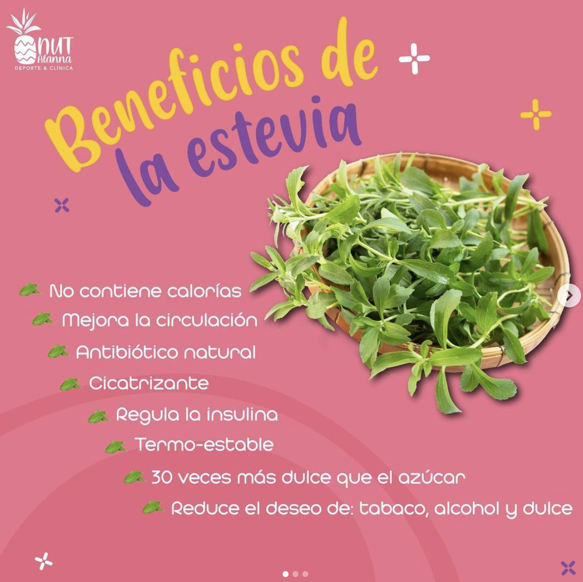 ¿Conoces todos los beneficios que tiene la estevia?😍☘️👉🏻Checa este post porque te comparto algunos beneficios de esta #superfood junto con algunos tips de como usarla. 🤩Otro super beneficio de la estevia es que es fácil de encontrar y en diferentes presentaciones.😌Además, es una opción segura para todos, incluidas personas que padecen diabetes. 😊👉🏻La puedes conseguir en mi consultorio o en en mi página web www.nutalanna.com/productos