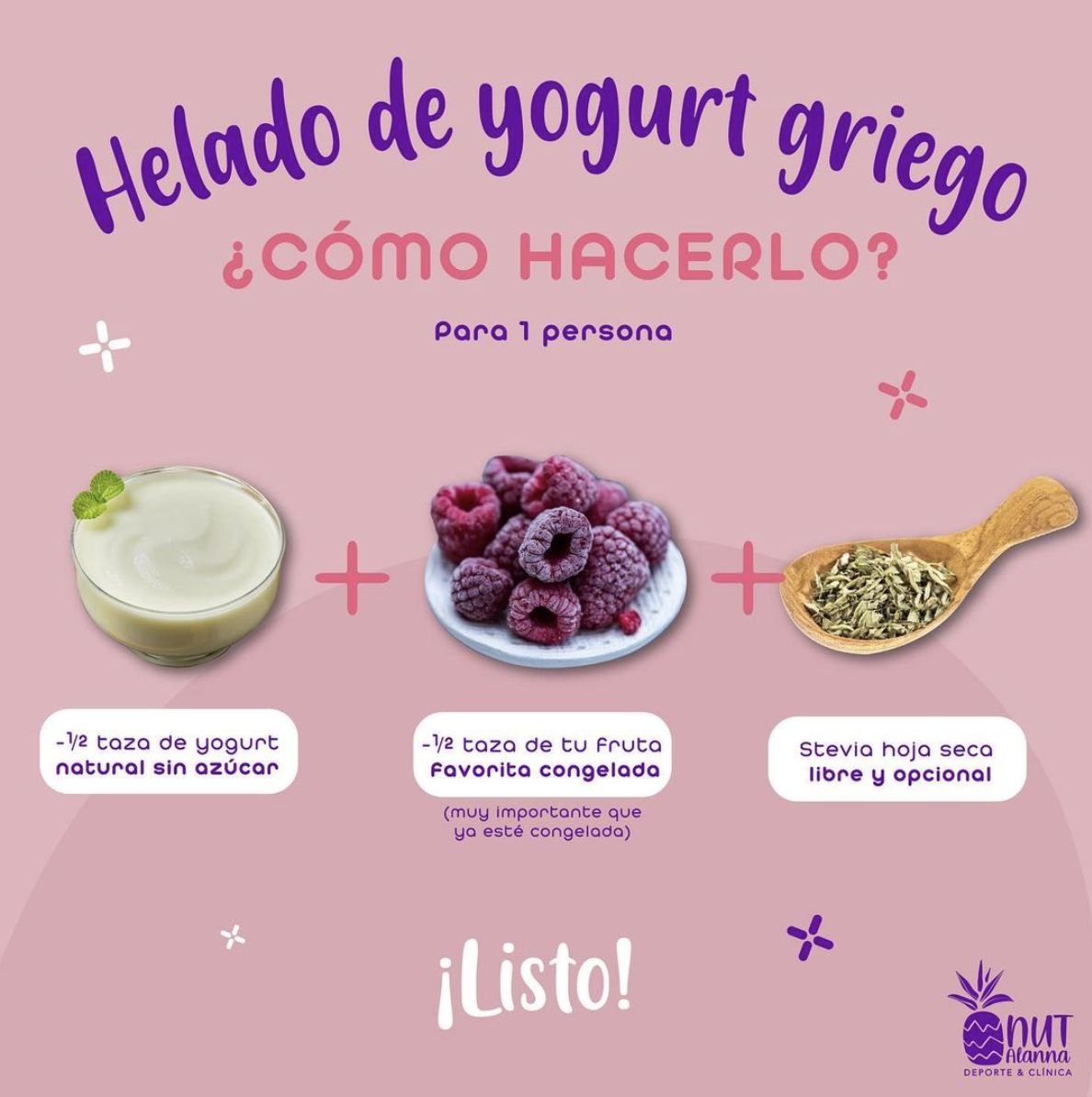 Helado de yogurt:🍧¿Cómo hacerlo?🤔Para 1 persona:-½ taza de yogurt natural sin azúcar-½ taza de tu fruta favorita congelada. (muy importante que ya esté congelada).🍎🍉🍌🍃-Estevia hoja seca libre y opcional.👉🏻Marcas de yogurt que recomiendo: fage, chobani o yoplait sin azúcar.🤗Recuerda que tengo mi marca de estevia (ideal para la receta), Estevia Nut Alanna.Si lo haces etiquétame para ver como te quedo 🤩✨